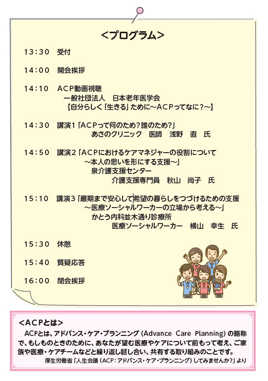 近年、医療・介護の現場では「自分らしい生き方・最期の迎え方」を考え、話し合うことの大切さが注目されていますが、病気や認知症などにより自分の意思や希望を伝えることが難しくなることもあります。「もしもの時」に備え、自分が大切にしたいことや希望する医療・ケアについて信頼できる人と話し合っておく「ACP」の必要性が高まっています。